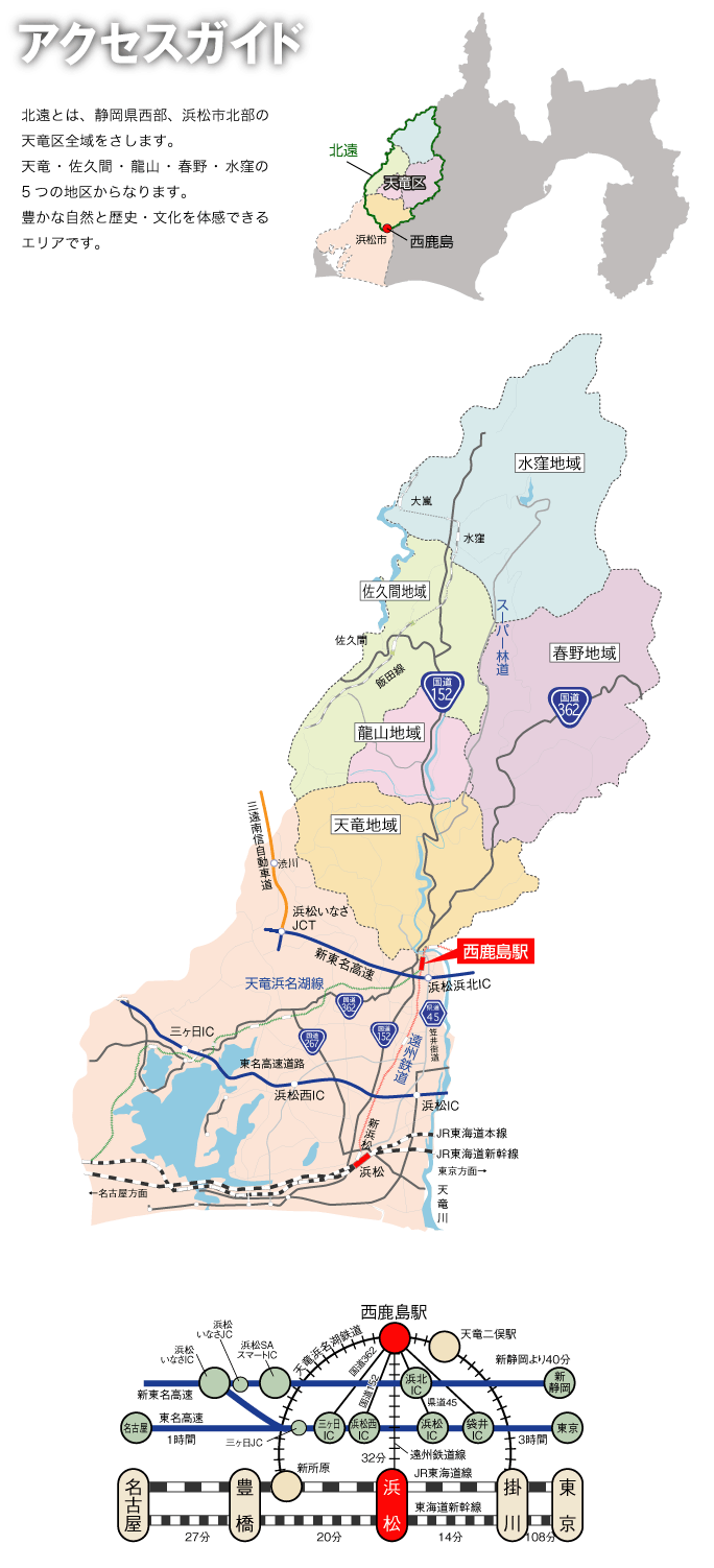 * 佐久間町・水窪町へは、JR飯田線が利用できます。またJR飯田線は、北遠地域内でも交通としても利用できます。